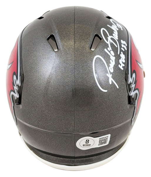 This Autographed Speed Mini Helmet with the inscription of "HOF 23" has been Personally Signed by Ronde Barber of the Tampa Bay Buccaneers. This item is 100% Authentic to include a hologram by Beckett Authentication Services. This item will come with an affixed Beckett Authentication Services (BAS) authentication sticker, which includes a scannable QR code to verify authenticity. Please note that Beckett no longer provides serial-numbered COA cards, and the attached BAS sticker will serve as the complete authentication for this item. This is a BAS Witnessed Protection Program item which means a Beckett Authentication Service representative was present when this item was being signed. We conducted an autograph signing with Ronde Barber where multiples of the same item were signed. While the photographs are representative of this item, the size, placement and strength of the signature may vary. Each item is hand signed, therefore, each autograph is unique. This item can be verified through BAS Witnessed.