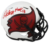 This Autographed Alternate Lunar Speed Mini Helmet with the inscription of "HOF 13" has been Personally Signed by Warren Sapp of the Tampa Bay Buccaneers. This item is 100% Authentic to include a hologram by Beckett Authentication Services. This item will come with the new Beckett Authentication hologram that has a scannable QR code rather than the traditional COA. If you would like to have a COA, you are welcome to reach out to Beckett for a printed certification once you receive your item. This is a BAS Witnessed Protection Program item which means a Beckett Authentication Service representative was present when this item was being signed. This is a stock item. We conducted an autograph signing with Warren Sapp and we have several of these available. The one you will receive will be of equal quality to the one pictured. This item can be verified through BAS Witnessed.