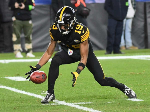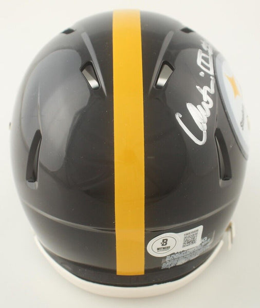 Riddell Pittsburgh Steelers speed mini helmet. Hand-signed by Calvin Austin III.The autograph includes an official Beckett Authentication Services serially numbered hologram and QR Code card for authenticity purposes. The signing of this item was witnessed by Beckett.Authentication: Beckett QR Code card