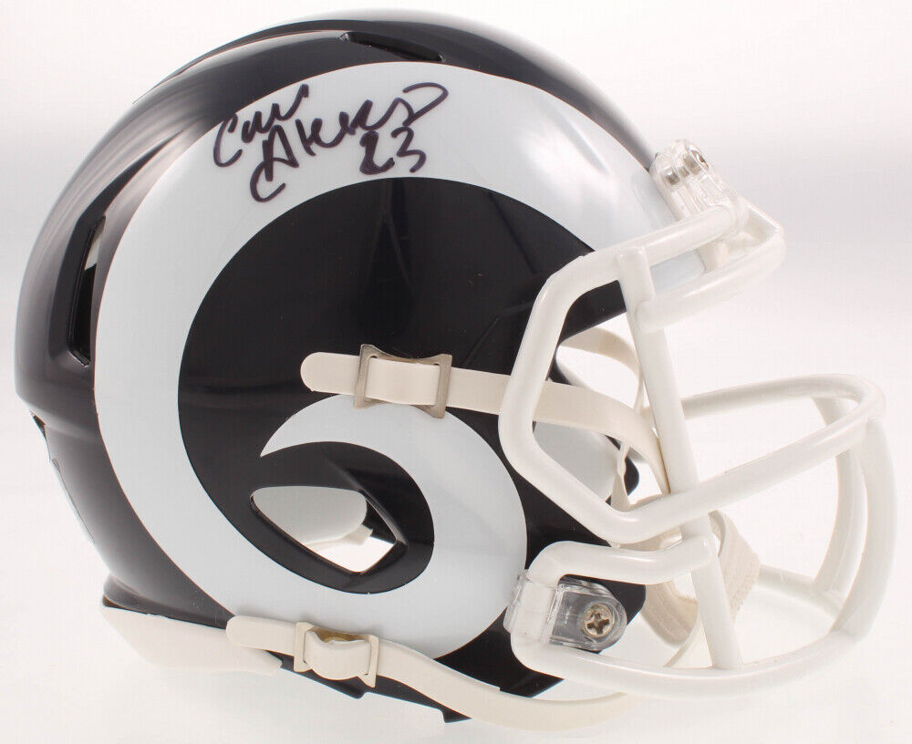 Los Angeles Rams Speed Mini helmet. Hand-signed in black felt-tip pen by Cam Akers. The lot / autograph(s) includes an official Beckett Authentication Services serially-numbered hologram and matching COA for authenticity purposes. The signing of this item was witnessed by Beckett.Authentication: Beckett COA