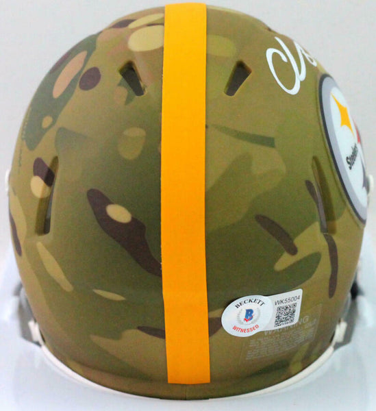 Chase Claypool Autographed Pittsburgh Steelers Camo Mini Helmet- Beckett W*White This is a Chase Claypool of the Pittsburgh Steelers hand autographed Riddell Football Camo Speed Mini Helmet. This item has a Beckett Witnessed Authentication, which comes with a numbered and a matching Beckett Certificate of Authenticity. You can view this item on the Beckett Authentication website and it shows when and where the item was signed. It was signed either at a public autograph appearance or a private signing. This is a stock photo of the item. Although you may not receive this exact item, the item you receive is virtually identical, brand new, and in great shape.