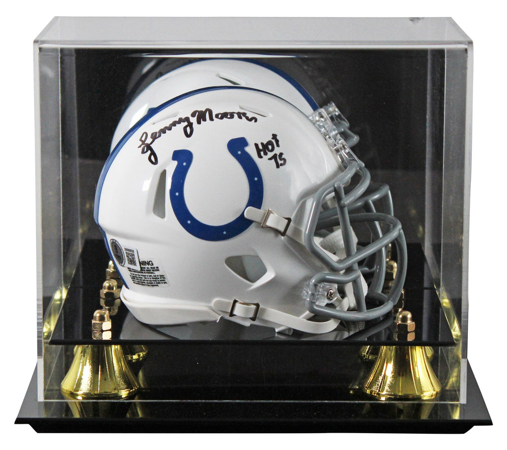 This Autographed Speed Mini Helmet W/ Uv Mirrored Back Acrylic Display Case with the inscription of "HOF 75" has been Personally Signed by Lenny Moore of the Indianapolis Colts. This item is 100% Authentic to include a hologram by Beckett Authentication Services. This item will come with an affixed Beckett Authentication Services (BAS) authentication sticker, which includes a scannable QR code to verify authenticity. Please note that Beckett no longer provides serial-numbered COA cards, and the attached BAS sticker will serve as the complete authentication for this item. This is a BAS Witnessed Protection Program item which means a Beckett Authentication Service representative was present when this item was being signed. We conducted an autograph signing with Lenny Moore where multiples of the same item were signed. While the photographs are representative of this item, the size, placement and strength of the signature may vary. Each item is hand signed, therefore, each autograph is unique. This item can be verified through BAS Witnessed.