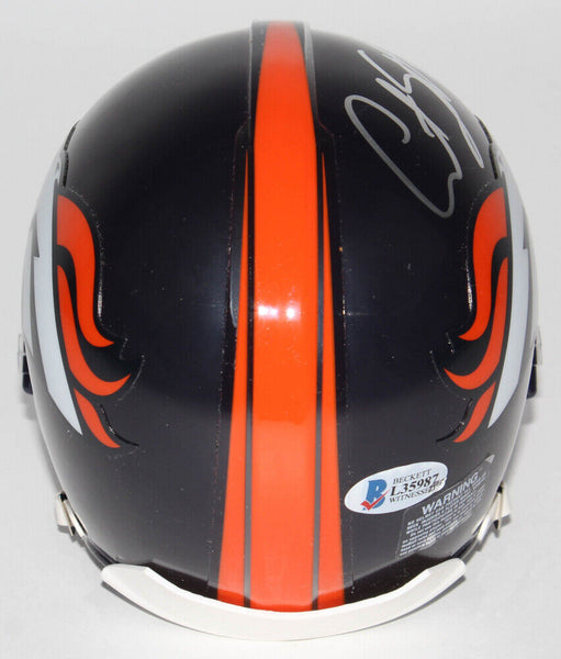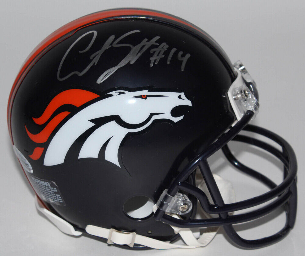 Riddell Denver Broncos mini helmet. Hand-signed in silver paint pen by Courtland Sutton. The lot / autograph(s) includes an official Beckett Authentication Services serially numbered hologram and matching COA for authenticity purposes. The signing of this item was witnessed by Beckett.Authentication: Beckett COA