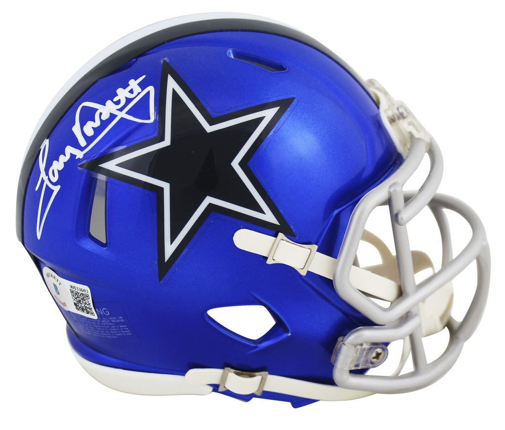 This Autographed Alternate Flash Speed Mini Helmet has been Personally Signed by Tony Dorsett of the Dallas Cowboys. This item is 100% Authentic to include a hologram by Beckett Authentication Services. This item will come with the new Beckett Authentication hologram that has a scannable QR code rather than the traditional COA. If you would like to have a COA, you are welcome to reach out to Beckett for a printed certification once you receive your item. This is a BAS Witnessed Protection Program item which means a Beckett Authentication Service representative was present when this item was being signed. We conducted an autograph signing with Tony Dorsett where multiples of the same item were signed. While the photographs are representative of this item, the size, placement and strength of the signature may vary. Each item is hand signed, therefore, each autograph is unique. This item can be verified through BAS Witnessed.