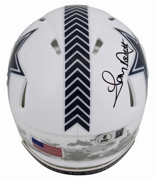 This Autographed w/ Black Signature Alternate 2024 Salute To Service III Speed Mini Helmet has been Personally Signed by Tony Dorsett of the Dallas Cowboys. This item is 100% Authentic to include a hologram by Beckett Authentication Services. This item will come with an affixed Beckett Authentication Services (BAS) authentication sticker, which includes a scannable QR code to verify authenticity. Please note that Beckett no longer provides serial-numbered COA cards, and the attached BAS sticker will serve as the complete authentication for this item. This is a BAS Witnessed Protection Program item which means a Beckett Authentication Service representative was present when this item was being signed. We conducted an autograph signing with Tony Dorsett where multiples of the same item were signed. While the photographs are representative of this item, the size, placement and strength of the signature may vary. Each item is hand signed, therefore, each autograph is unique. This item can be verified through BAS Witnessed.