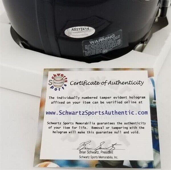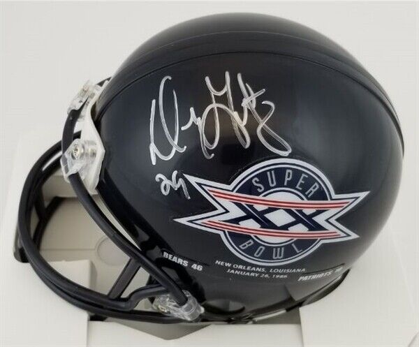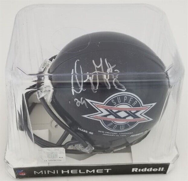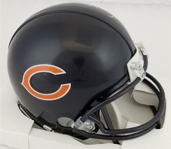 Riddell Bears Super Bowl XX Logo mini helmet. Hand-signed in silver paint pen by Dennis Gentry. The lot / autograph(s) includes an official Schwartz Sports Hologram and matching COA for authenticity purposes.Authentication: Schwartz Sports COA
