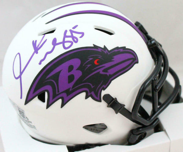 Derrick Mason Autographed Ravens Lunar Speed Mini Helmet-Beckett W Hologram This is a hand autograph of Derrick Mason of the Baltimore Ravens on a Riddell Football Lunar Speed Mini Helmet. This item has a Beckett Witnessed Authentication, which comes with a numbered hologram and generic COA. You can view this item on the Beckett Witnessed Authentication website and it shows when and where the item was signed. It was signed either at a public autograph appearance or a private signing. This is a stock photo of the item. Although you may not receive this exact item, the item you receive is virtually identical and brand new in great shape.