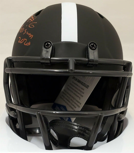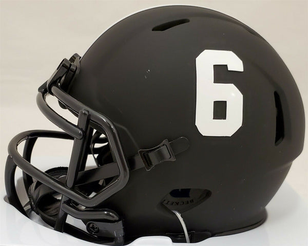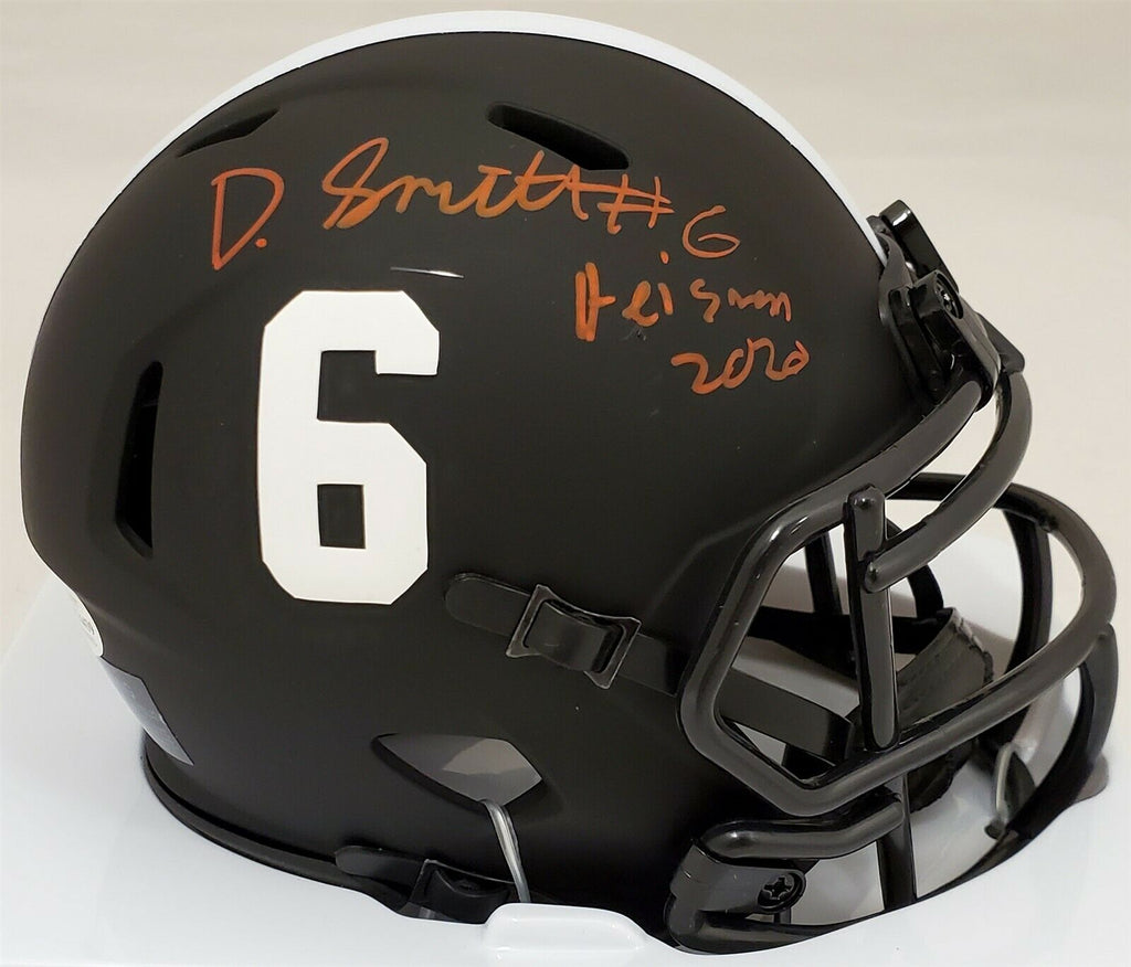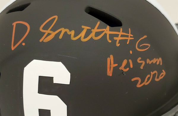This is an Eclipse Black Alabama Crimson Tide Speed Mini Helmet that has been hand signed by Devonta Smith. Smith inscribed this item "Heisman 2020." This item has been certified authentic by Beckett (BAS) and comes with their tamper-proof sticker and matching certificate of authenticity. NOTE: The Eclipse Black helmets are very delicate and often have some marks or scratches on them.