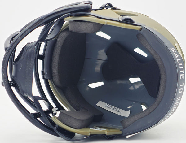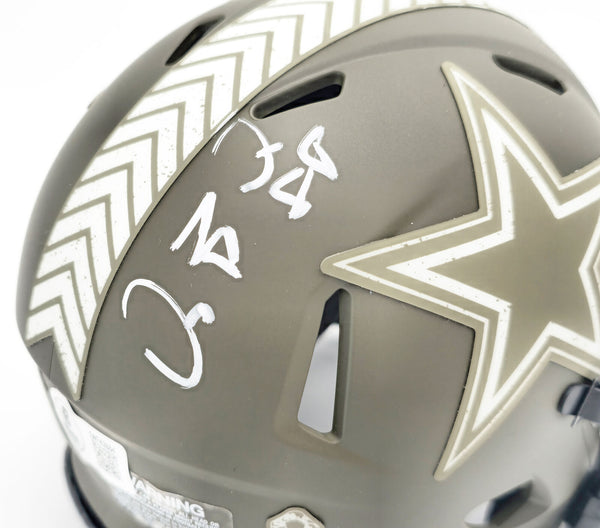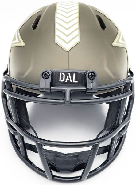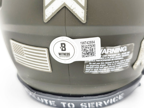 This is a Dallas Cowboys Army Green Salute to Service Speed Mini Helmet that has been hand signed by Dez Bryant. This item has been witnessed and certified authentic by Beckett Authentication (BAS) and comes with their tamper-proof witness sticker.