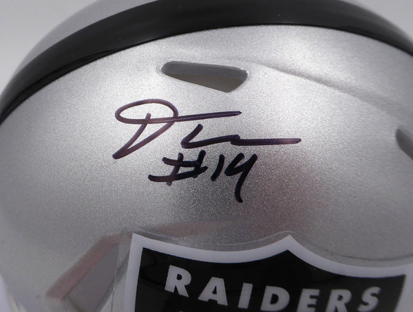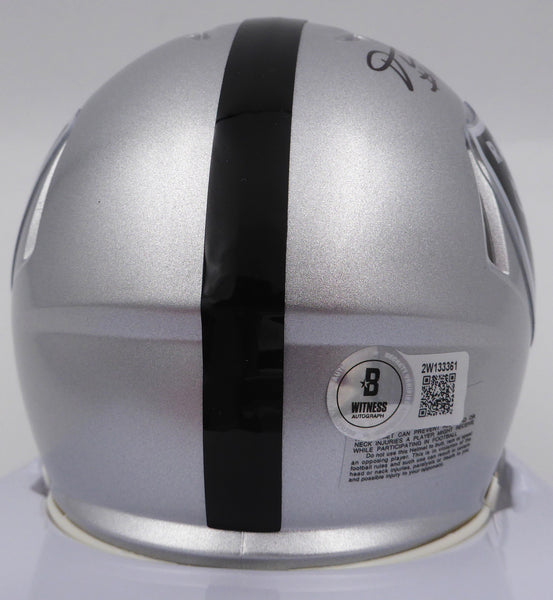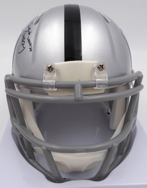 This is a Las Vegas Raiders Mini Helmet that has been hand signed by DJ D.J. Turner. This item was inscribed "Just Win Baby." There is an imperfection in the signature as shown. This item has been certified authentic by Beckett Authentication (BAS) and comes with their tamper-proof QR Code hologram.