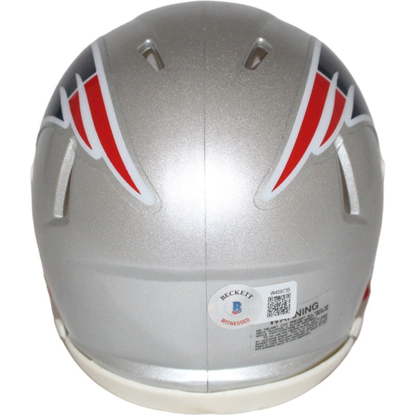 Drew Bledsoe Signed New England Patriots Speed Mini Helmet Beckett 42404 The number in the listing title is just an inventory sku for our records and is not the authentication number. The item pictured is a stock photo unless otherwise noted. This is a New England Patriots Speed Mini Helmet that was personally autographed by Drew Bledsoe. Includes a certificate of authenticity from Beckett Authentication Services (BAS) and Denver Autographs.