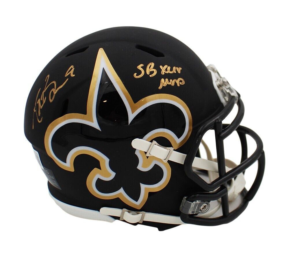 A New Orleans Saints Speed Amp NFL Mini Helmet hand signed by Drew Brees. The item and signature are in excellent condition. In addition to signing his name Drew inscribed "SB MVP" on the item. Drew is a 12x Pro Bowler, Super Bowl Champion, Super Bowl MVP, and 2x NFL Offensive Player of the Year. AUTHENTICATION: The item is accompanied by a Beckett Certificate of Authenticity- Beckett Serial Numbered and Databased Hologram