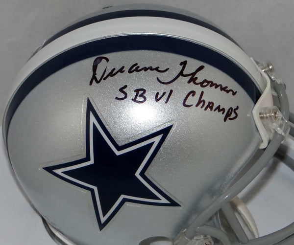 Duane Thomas Autographed Dallas Cowboys Mini Helmet W/ SB Champs- Jersey Source Authenticated This is a Hand Autographed Helmet of Duane Thomas of The Dallas Cowboys. This item has a Jersey Source Authentication, which comes with a numbered sticker and a matching COA. You can view this item on the Jersey Source website, it shows when and where the item was signed. It was signed either at a public autograph appearance or a private signing. This is a stock photo of the item. Although you may not receive this exact item, the item you receive is virtually identical and brand new in great shape.