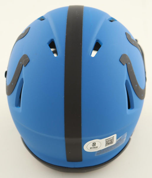Riddell Indianapolis Colts Rave Alternate Speed Mini Helmet. Hand-signed and inscribed by Dwight Freeney (HOF).The autograph includes an official Beckett Authentication Services serially numbered scannable hologram and QR Code card for authenticity purposes. The signing of this item was witnessed by Beckett.Authentication: Beckett Scannable Hologram with QR Code card