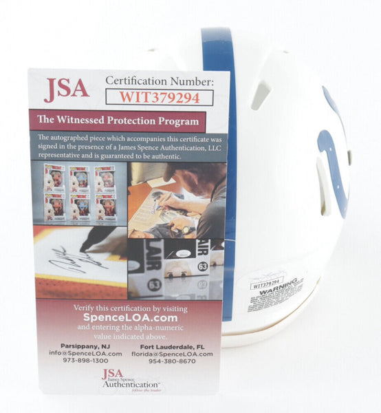 Riddell Indianapolis Colts speed mini helmet has been hand-signed by Dwight Freeney.The lot / autograph(s) includes an official James Spence Authentication (JSA) hologram and matching COA for authenticity purposes. The signing of this item was witnessed by JSA.Authentication: JSA COA