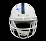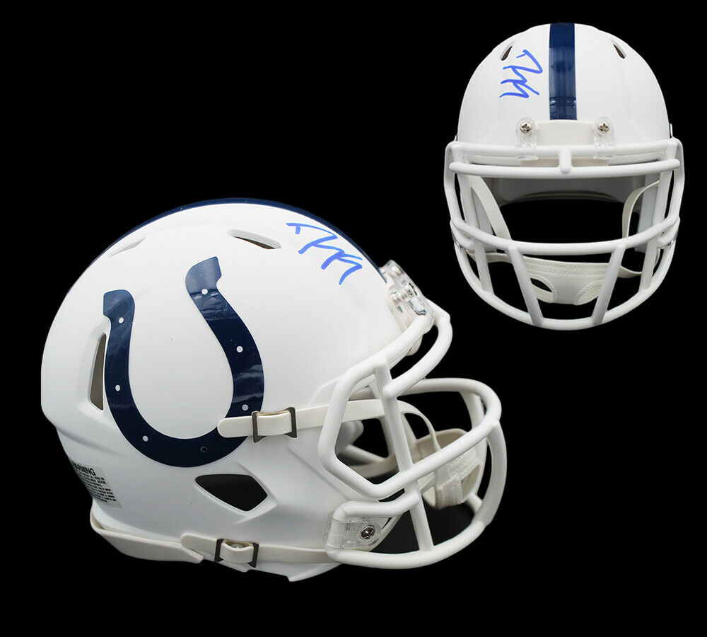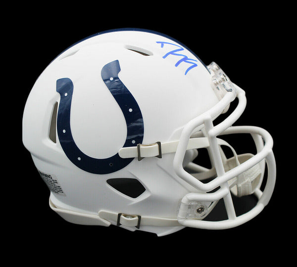 An Indianapolis Colts Speed White Matte NFL Mini Helmet hand signed by Dwight Freeney. The item and signature are in excellent condition. Dwight is a football defensive end. He was selected in round 1 of the 2002 drafts my the Indianapolis Colts were he spent the majority of his career. He is a SB Champ, 7x Pro Bowler, 3x Firts-Team All Pro, NFL Sacks leader and was on the NFL's 2000s All-Decade Team. AUTHENTICATION: The item is accompanied by a Certificate of Authenticity - Serial Numbered and Databased Hologram - Picture of Dwight from the signing