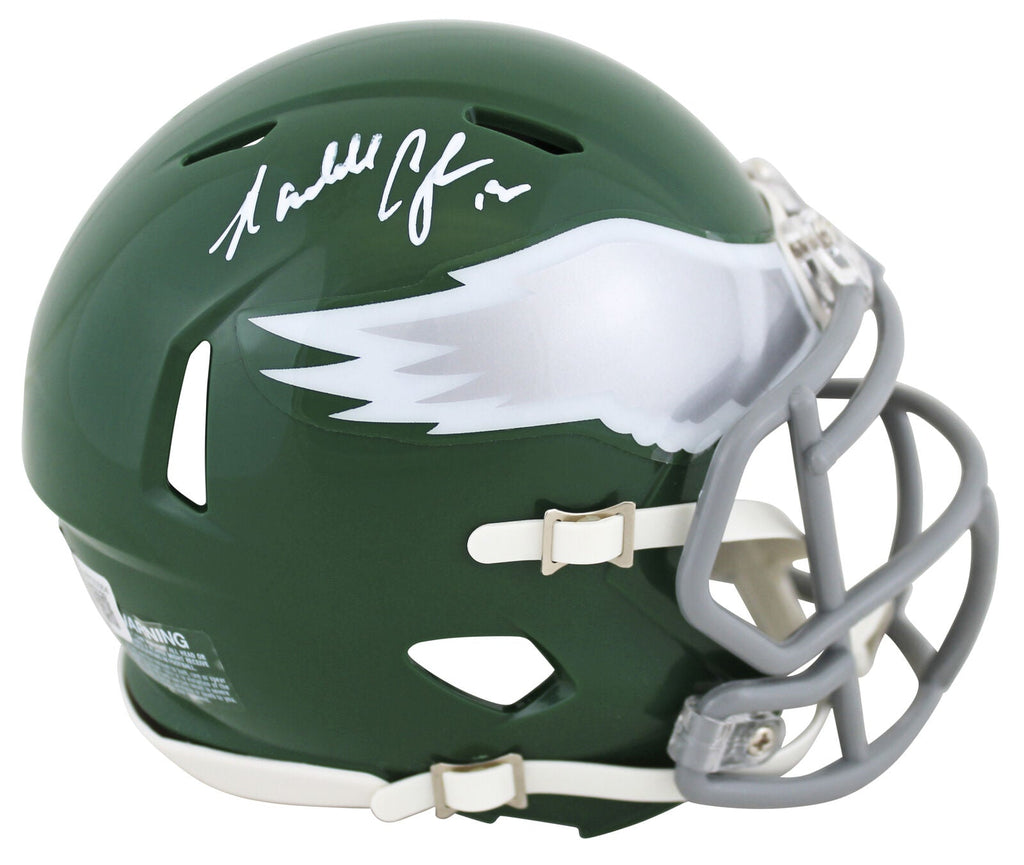 This Autographed 1974-95 Throwback Speed Mini Helmet has been Personally Signed by Randall Cunningham of the Philadelphia Eagles. This item is 100% Authentic to include a Certificate of Authenticity (COA) / hologram by Beckett Authentication Services. This is a BAS Witnessed Protection Program item which means a Beckett Authentication Service representative was present when this item was being signed. We conducted an autograph signing with Randall Cunningham where multiples of the same item were signed. While the photographs are representative of this item, the size, placement and strength of the signature may vary. Each item is hand signed, therefore, each autograph is unique. This item can be verified through BAS Witnessed.