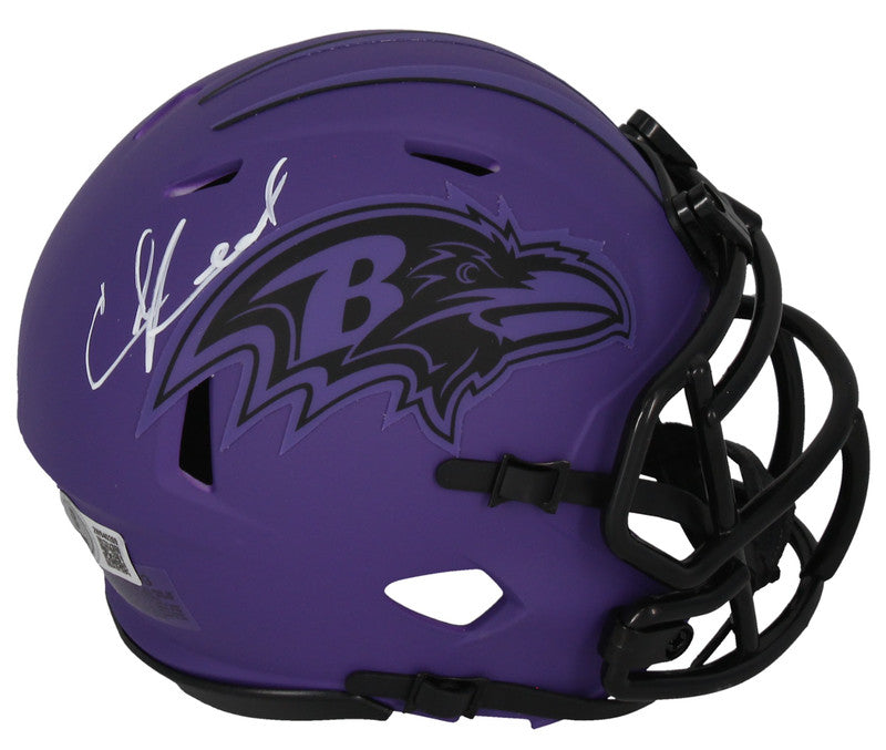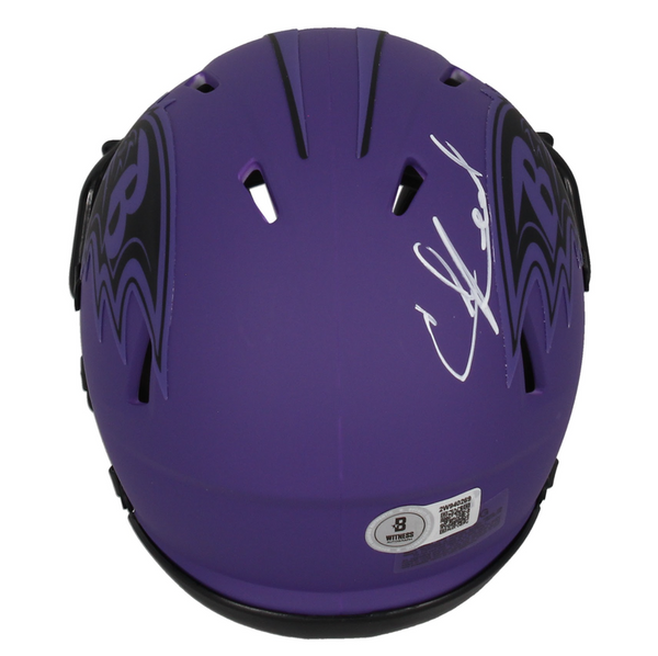 This Baltimore Ravens mini speed RAVE helmet has been personally hand-signed by Ed Reed. This helmet must be seen in person to truly appreciate. It comes with an individually numbered, tamper-evident hologram from Beckett Authentic. To ensure authenticity, the hologram can be reviewed online. This process helps to ensure that the product purchased is authentic and eliminates any possibility of duplication or fraud.