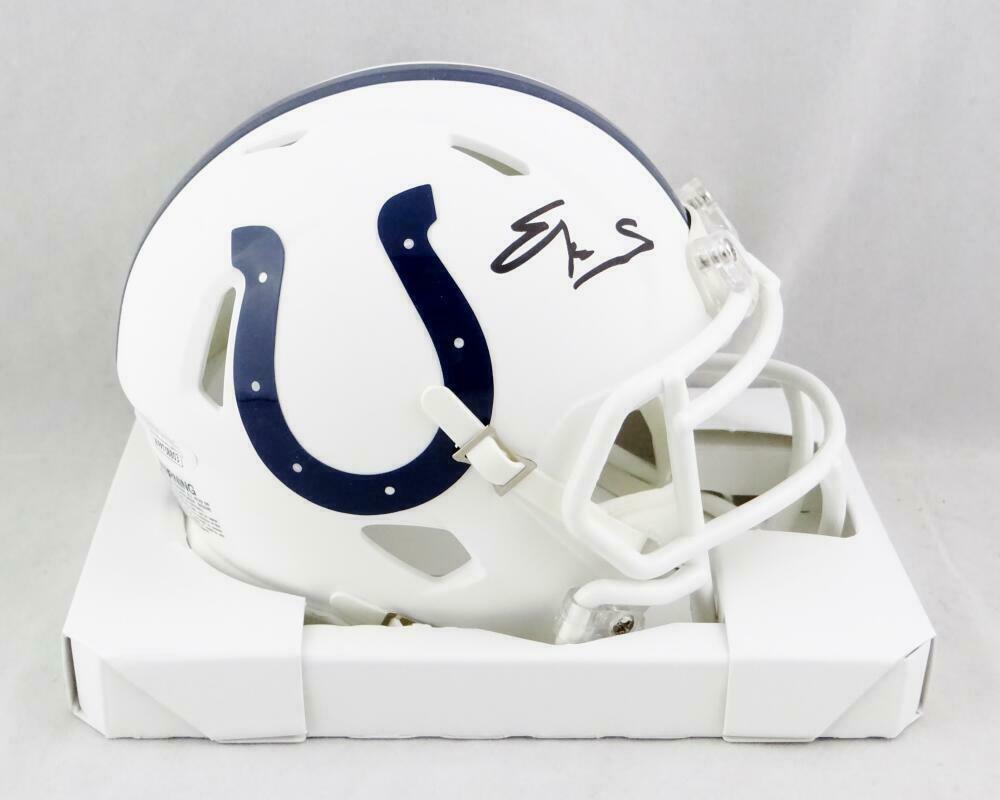 Edgerrin James Autographed Indianapolis Colts Flat White Mini Helmet - JSA W Auth *Black This is a hand autograph of Edgerrin James of the Indianapolis Colts on a Riddell Football Flat White Speed Mini Helmet. This item is inscribed with HOF. This item has a James Spence Witness Protection Authentication, which comes with a numbered sticker and a matching JSA Certificate of Authenticity. You can view this item on the SpenceLOA website and it shows when and where the item was signed. It was signed either at a public autograph appearance or a private signing. This is a stock photo of the item. Although you may not receive this exact item, the item you receive is virtually identical and brand new in great shape.