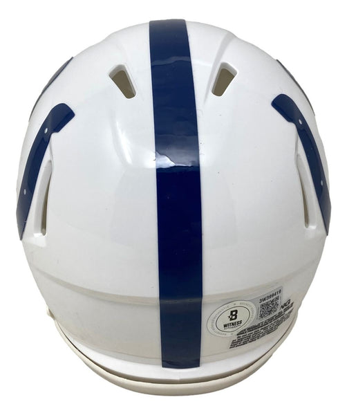 Featured is an Edgerrin James signed Indianapolis Colts mini speed helmet. This helmet has been hand signed by James and comes with the Beckett hologram and certificate of authenticity. This helmet would make a great addition to any sports memorabilia collection.. SPECIFICATIONS Autographed By: Edgerrin James Team: Indianapolis Colts Sport: Football Authentication: Beckett Grading Services