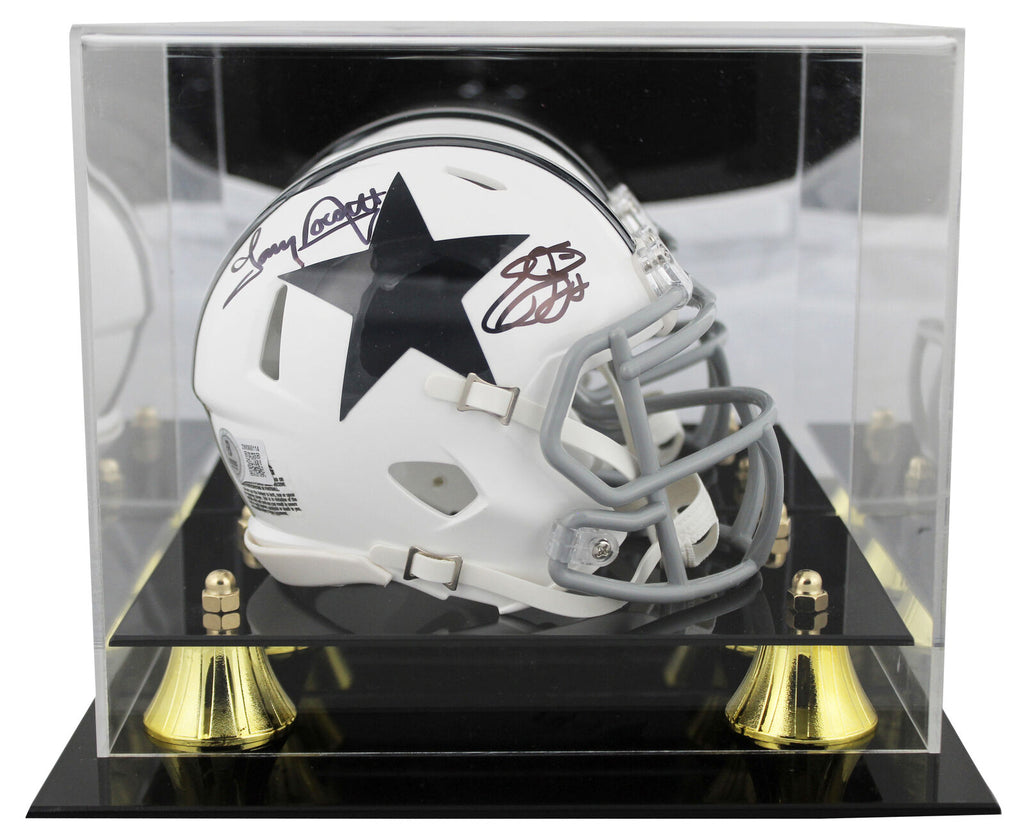 This Autographed 1960-63 Throwback Speed Mini Helmet W/ Uv Mirrored Back Acrylic Display Case has been Personally Signed by Emmitt Smith & Tony Dorsett of the Dallas Cowboys. This item is 100% Authentic to include a hologram by Beckett Authentication Services. This item will come with an affixed Beckett Authentication Services (BAS) authentication sticker, which includes a scannable QR code to verify authenticity. Please note that Beckett no longer provides serial-numbered COA cards, and the attached BAS sticker will serve as the complete authentication for this item. This is a BAS Witnessed Protection Program item which means a Beckett Authentication Service representative was present when this item was being signed. We conducted an autograph signing with Emmitt Smith & Tony Dorsett where multiples of the same item were signed. While the photographs are representative of this item, the size, placement and strength of the signature may vary. Each item is hand signed, therefore, each autograph is unique. This item can be verified through BAS Witnessed.