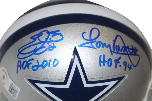 Emmitt Smith & Tony Dorsett Signed Cowboys VSR4 Mini Helmet HOF BAS 37345 The number in the listing title is just an inventory sku for our records and is not the authentication number. The item pictured is a stock photo unless otherwise noted. This is a Dallas Cowboys VSR4 mini helmet that was personally autographed by both Emmitt Smith and Tony Dorsett with HOF inscriptions. Includes a certificate of authenticity from Beckett Authentication Services (BAS) and Denver Autographs.