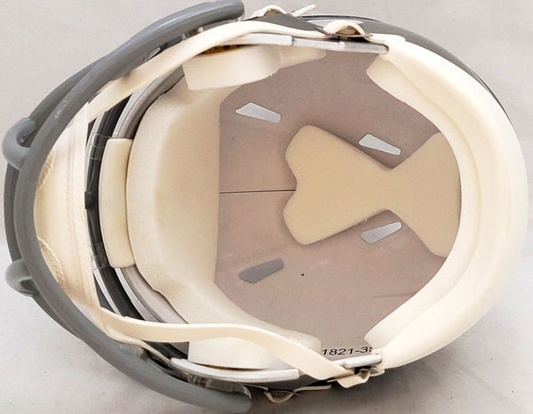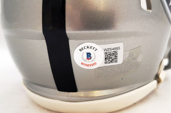 This is an Oakland Raiders Flash Gray Speed Mini Helmet that has been hand signed by Fred Biletnikoff. The Flash helmets are delicate and may have some marks or scratches on them. This item has been witnessed and certified authentic by Beckett Authentication (BAS) and comes with their tamper-proof witness sticker. Beckett Authentication has recently changed their physical certificate card policy where they no longer match their tamper-proof sticker with a physical certificate. A certificate can be printed on Beckett's website for the matching authentication number.