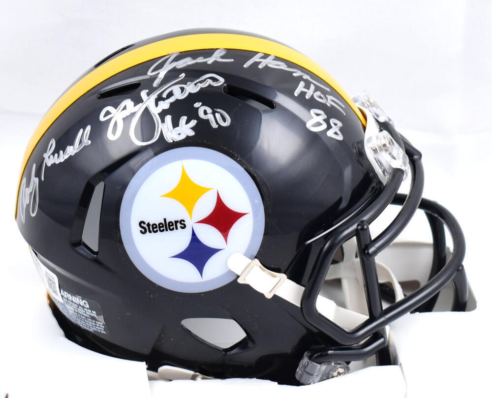 Ham Lambert Russell Autographed Pittsburgh Steelers Speed Mini Helmet-Beckett W Hologram *Silver This is a hand autographed helmet of Jack Ham, Jack Lambert, and Andy Russell of the Pittsburgh Steelers. This is a Riddell Football Speed Mini Helmet. Inscribed with HOF 90, HOF 88. This item has a Beckett Witnessed Authentication, which comes with a numbered hologram and a QR code for verification. You can view this item on the Beckett Authentication website, it shows when and where the item was signed. It was signed either at a public autograph appearance or a private signing. This is a stock photo of the item. Although you may not receive this exact item, the item you receive is virtually identical and brand new in great shape.
