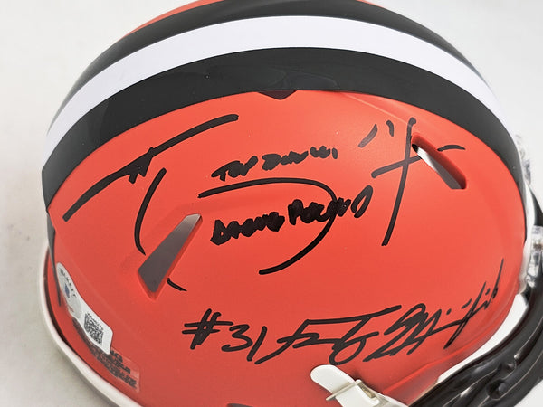 This is a Cleveland Browns Brown Speed Mini Helmet that has been hand signed by Hanford Dixon & Frank Minnifield. This item was inscribed "Dawg Pound." This item has been witnessed and certified authentic by Beckett Authentication (BAS) and comes with their tamper-proof witness sticker.