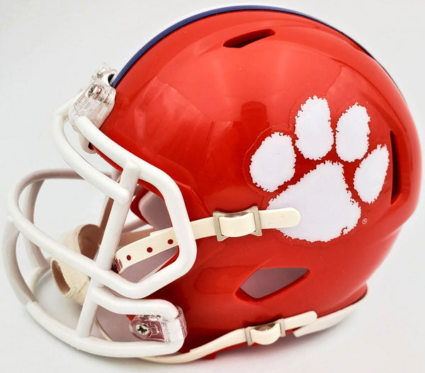 This is a Clemson Tigers Orange Speed Mini Helmet that has been hand signed by Hunter Renfrow. This item has been certified authentic by Beckett Authentication (BAS) and comes with their tamper-proof sticker and matching certificate of authenticity.