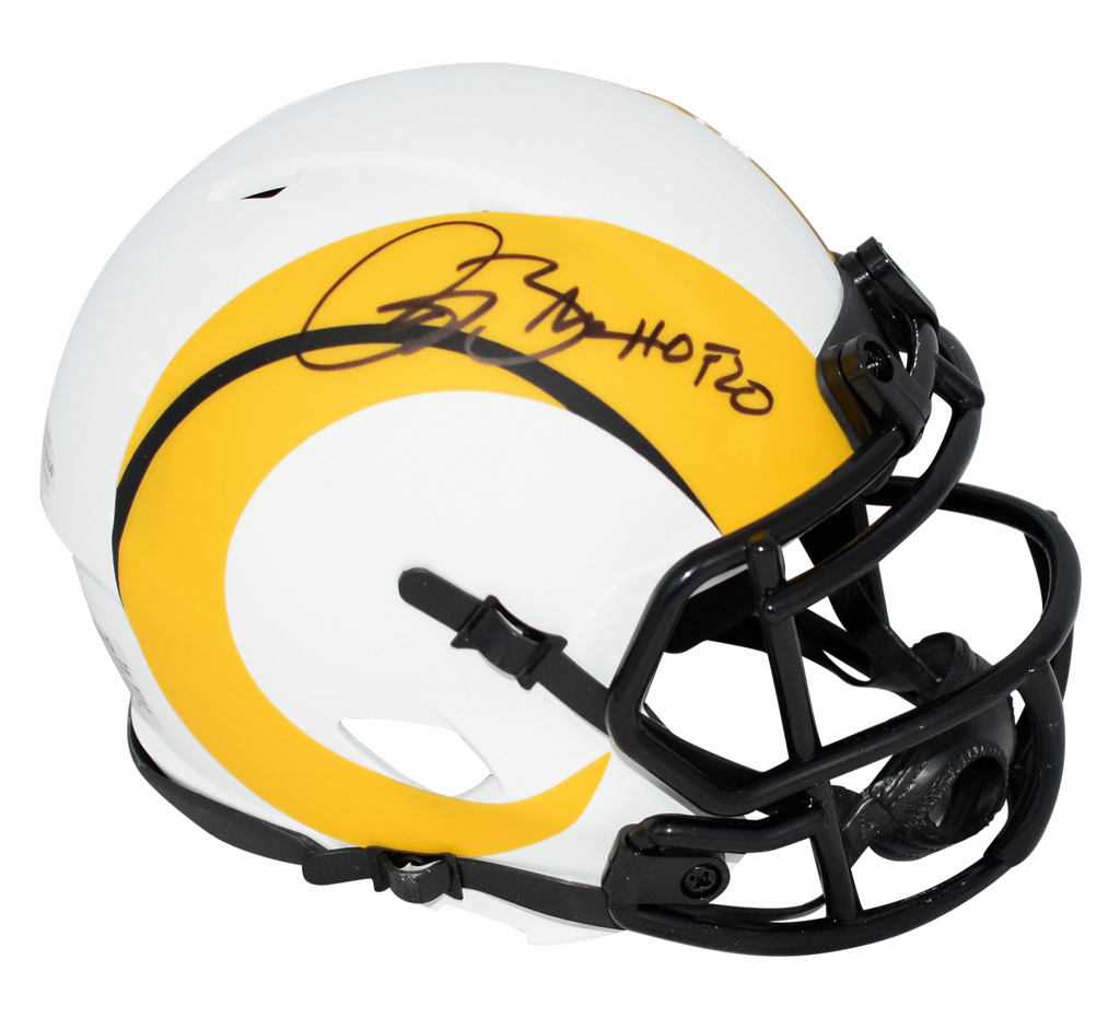 Isaac Bruce, former All-Pro wide receiver for the St. Louis Rams, has hand signed this Rams Riddell Speed Lunar mini helmet at a private signing. He included the inscription "HOF 20" with his signature. This item comes with a certificate of authenticity (COA) from Beckett Authentication Services and was signed in the presence of one of their representatives. You will receive a serial-numbered COA along with a matching serial-numbered sticker on the helmet. The authenticity can be verified online by entering the serial number.Item pictured may not be the exact item you will receive. It will be similar quality, and we guarantee your satisfaction.