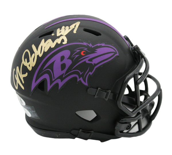 A Baltimore Ravens Speed Eclipse NFL Mini Helmet hand signed by J.K. Dobbins. The item and signature are in excellent condition. J.K. Dobbins is a football running back. He played college football at Ohio State before being drafted in the 2020 NFL Draft by the Baltimore Ravens. He was 2017 Big-10 Championship Game MVP & received the Earl Campbell Tyler Rose award. AUTHENTICATION: The item is accompanied by a JSA Certificate of Authenticity - JSA Serial Numbered and Databased Hologram