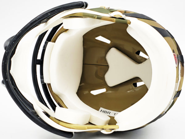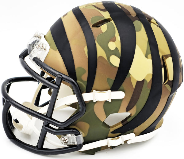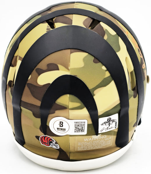This is a Cincinnati Bengals Camo Speed Mini Helmet that has been hand signed by Ja'Marr Chase. Because each Camo helmet is hand-dipped using water-transfer technology there may be slight imperfections. This item has been witnessed and certified authentic by Beckett Authentication (BAS) and comes with their tamper-proof witness sticker.
