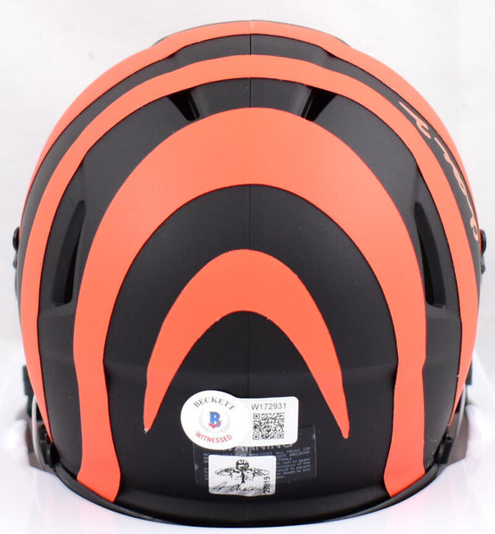 Ja'Marr Chase Autographed Cincinnati Bengals Eclipse Speed Mini Helmet -Beckett W Hologram *Orange This is a Ja'Marr Chase of the Cincinnati Bengals hand autographed Riddell Football Eclipse Speed Mini Helmet. This item has a Beckett Witnessed Authentication, which comes with a numbered hologram and a QR code for verification. You can view this item on the Beckett Authentication website. It was signed either at a public autograph appearance or a private signing. This is a stock photo of the item. Although you may not receive this exact item, the item you receive is virtually identical, brand new, and in great shape.