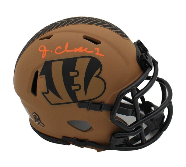 A Cincinnati Bengals Speed Salute to Service 2 NFL Mini Helmet hand signed by Ja'Marr Chase. The item and signature are in excellent condition. Ja'Marr is a Football wide receiver. He was selected in the 1st round of the 2021 NFL Draft by the Cincinnati Bengals. He played college football at LSU. The item is accompanied by a Beckett Serial Numbered and Databased Hologram