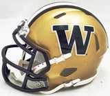 This is a Washington Huskies Gold Speed Mini Helmet that has been hand signed by Jalen McMillan. This item was signed in the presence of a Mill Creek Sports representative and comes with their serial numbered hologram and matching certificate of authenticity.