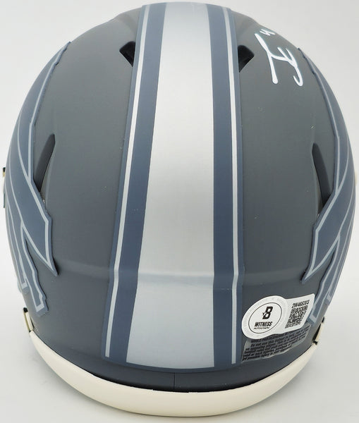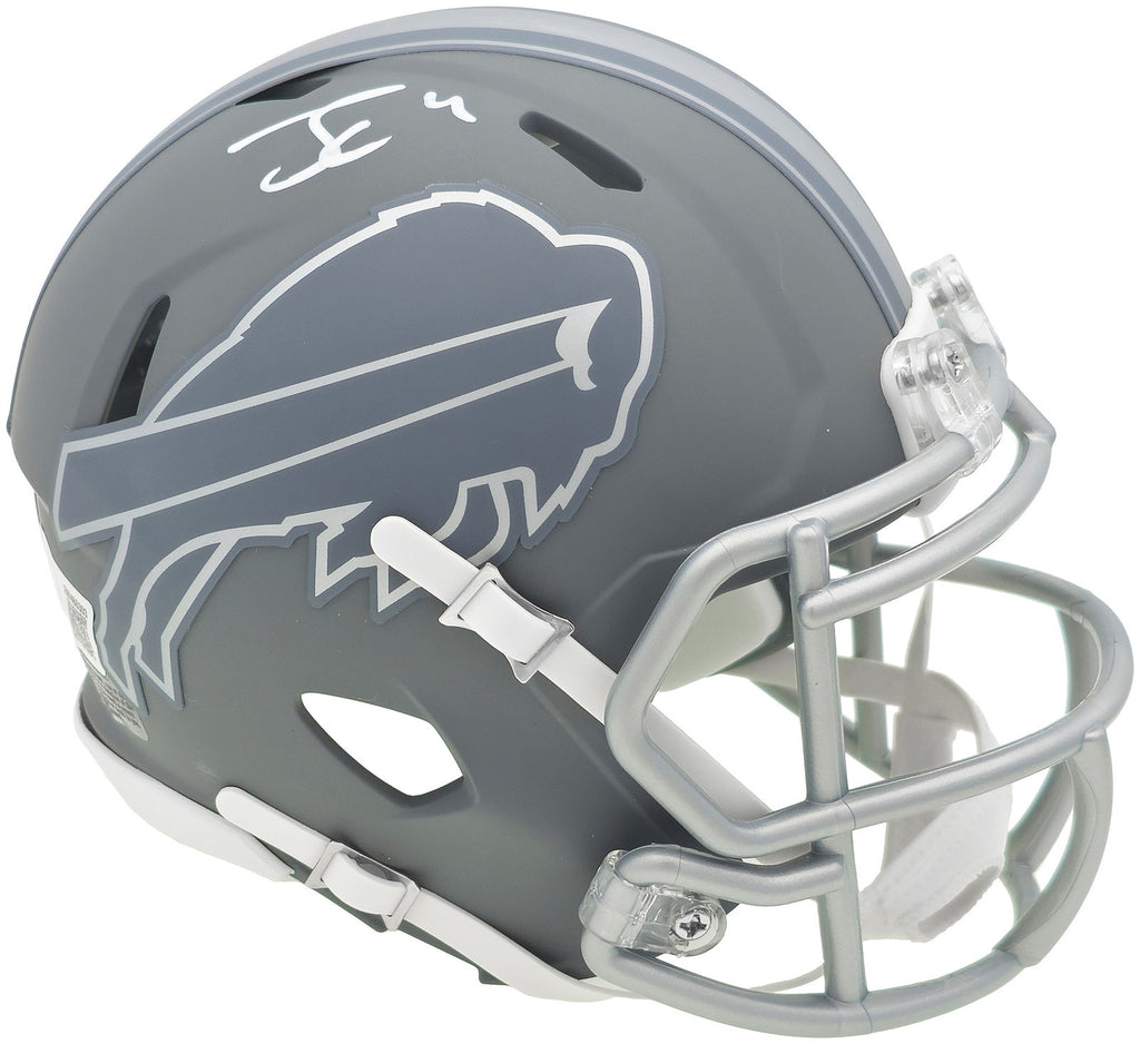 This is a Buffalo Bills Slate Gray Speed Mini Helmet that has been hand signed by James Cook. This item has been witnessed and certified authentic by Beckett Authentication (BAS) and comes with their tamper-proof witness hologram.