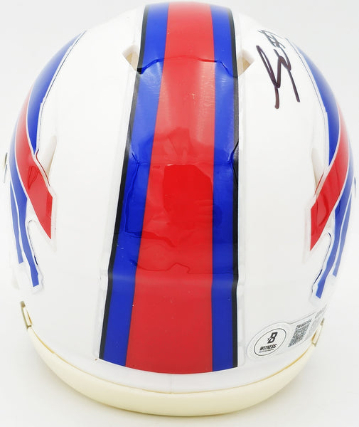 This is a Buffalo Bills White Speed Mini Helmet that has been hand signed by James Cook. This item has been witnessed and certified authentic by Beckett Authentication (BAS) and comes with their tamper-proof witness hologram.