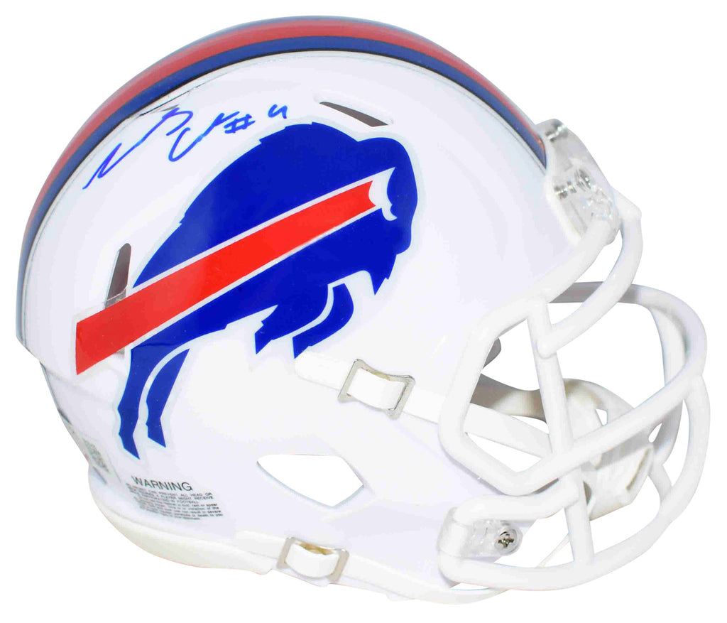 James Cook, star running back for the Buffalo Bills, has hand signed this Bills Riddell Speed mini helmet at a private signing. This item is authenticated by Beckett Authentication Services and was signed in the presence of one of their representatives. Their tamper-evident hologram featuring a QR code and serial number is on the item. The authenticity can be verified online by entering the serial number or scanning the QR code.Item pictured may not be the exact item you will receive. It will be similar quality, and we guarantee your satisfaction.