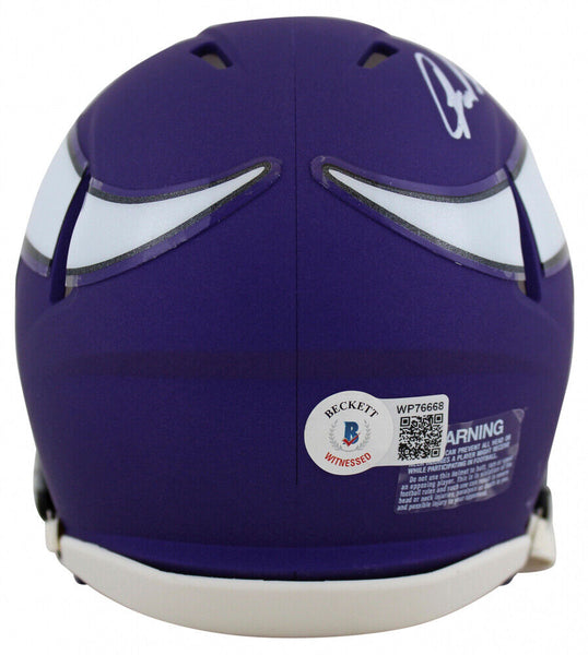 Riddell Vikings mini helmet has been hand-signed in silver paint pen by Jared Allen. The lot / autograph(s) includes an official Beckett Authentication Services serially numbered hologram for authenticity purposes. The signing of this item was witnessed by BeckettAuthentication: Beckett Hologram