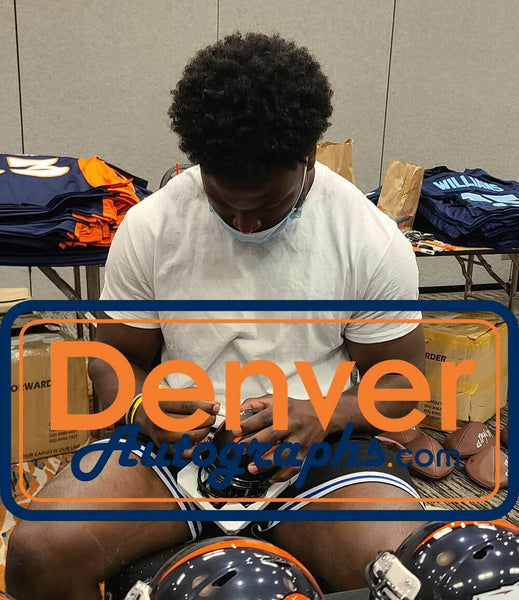 Javonte Williams Signed Denver Broncos Eclipse Speed Mini Helmet BAS 32098 The number in the listing title is just an inventory sku for our records and is not the authentication number. This is a Denver Broncos eclipse speed mini helmet that was personally autographed by Javonte Williams. Includes a certificate of authenticity from Beckett Authentication Services (BAS) and Denver Autographs.