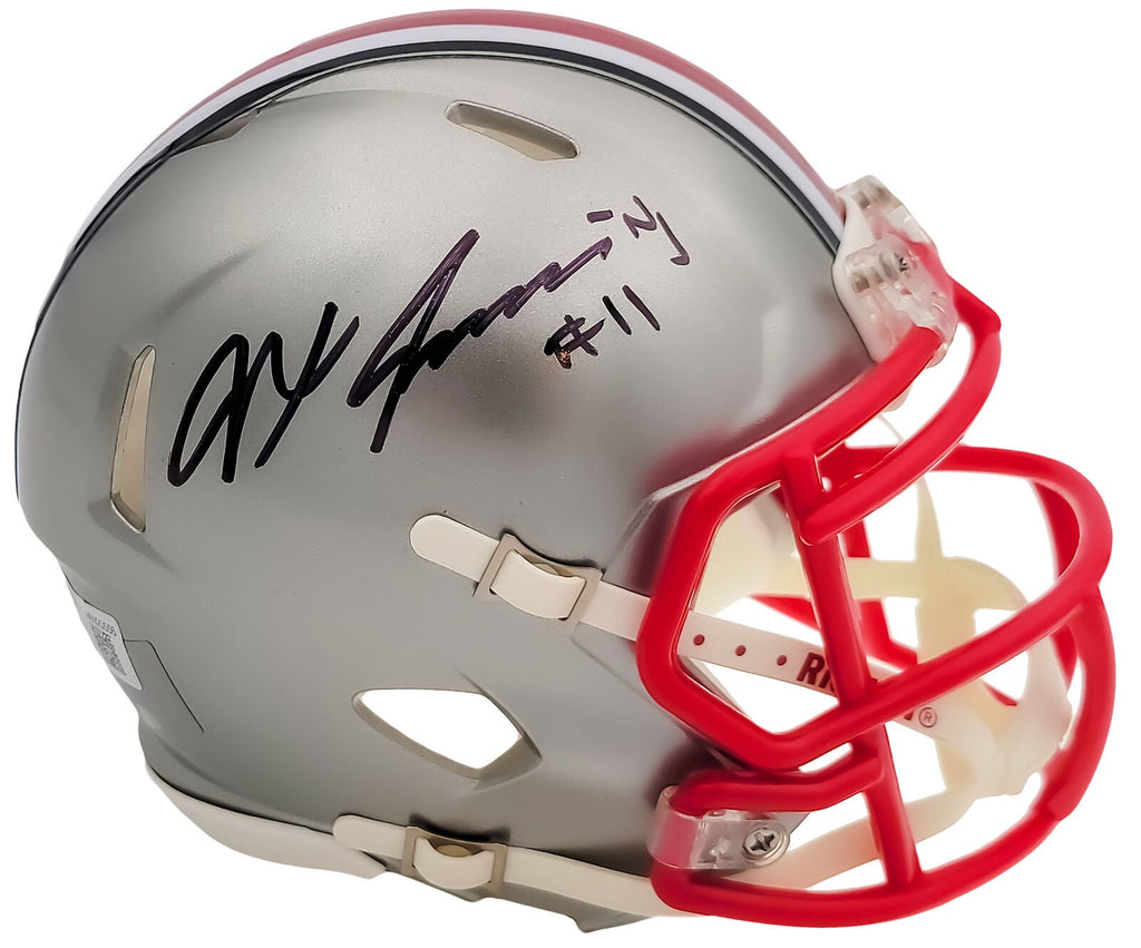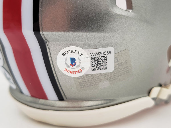 This is an Ohio State Buckeyes Flash Silver Speed Mini Helmet that has been hand signed by Jaxon Smith-Njigba. The Flash helmets are delicate and may have some marks or scratches on them. This item has been certified authentic by Beckett Authentication (BAS) and comes with their tamper-proof QR Code sticker that can be verified on the Beckett-authentication.com.