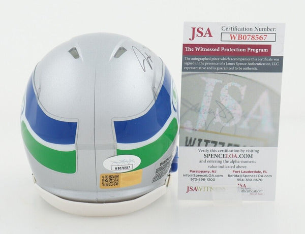 This autographed Riddell Lunar Eclipse Alternate Speed Mini Helmet has been personally hand-signed by Jaxon Smith-Njigba of the Seattle Seahawks.This autograph is certified by James Spence Authentication's (JSA) Witnessed Protection Program. That means that a JSA representative was present when this item was signed. It comes with the numbered hologram and matching Certificate of Authenticity.