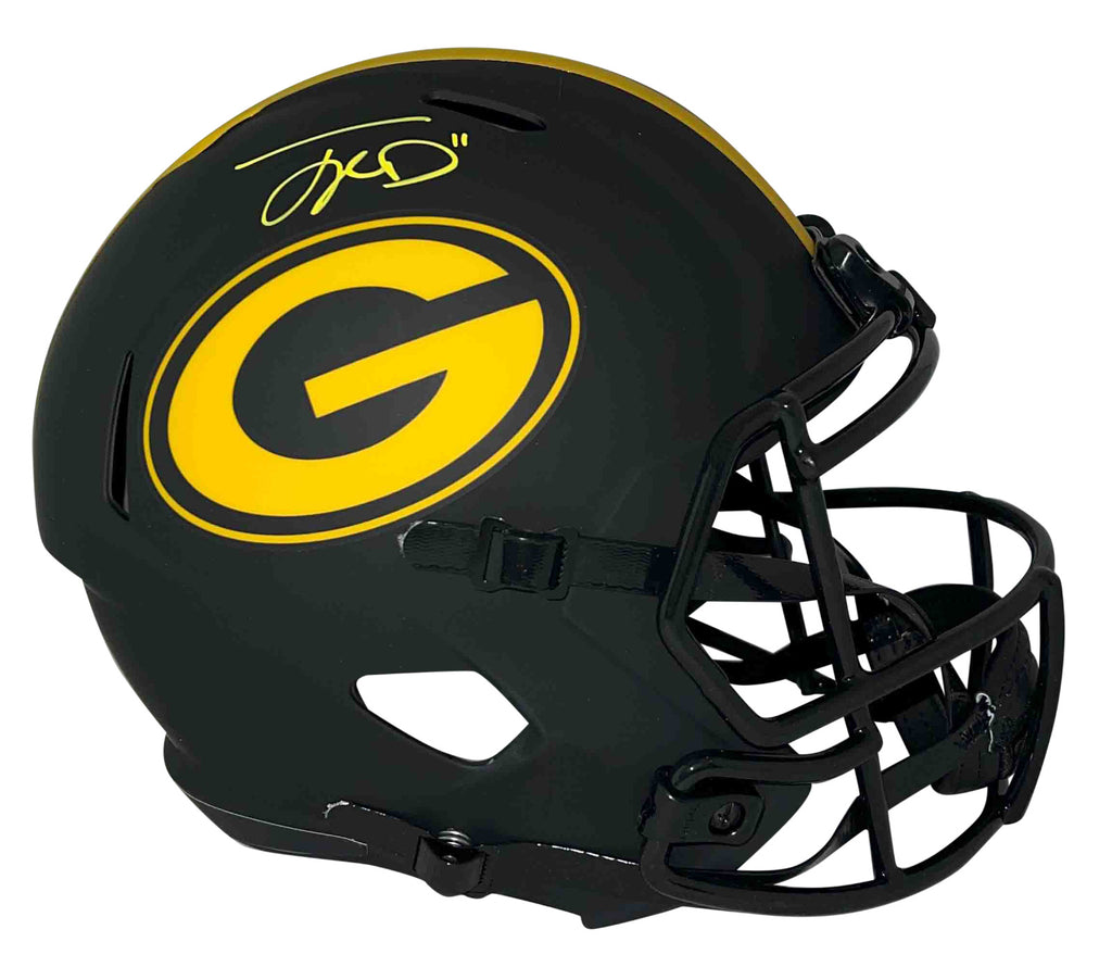 Jayden Reed, star wide receiver for the Green Bay Packers, has hand signed this Packers Riddell Speed Eclipse full-size replica helmet at a private signing. This item is authenticated by Beckett Authentication Services and was signed in the presence of one of their representatives. Their tamper-evident hologram featuring a QR code and serial number is on the item. The authenticity can be verified online by entering the serial number or scanning the QR code.Item pictured may not be the exact item you will receive. It will be similar quality, and we guarantee your satisfaction.