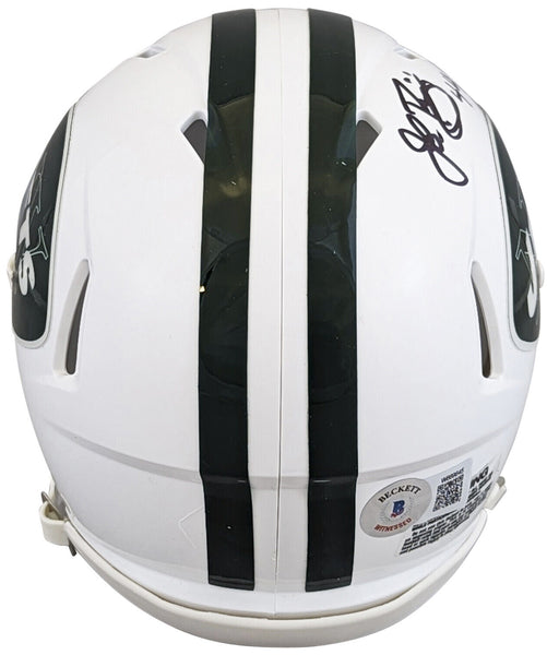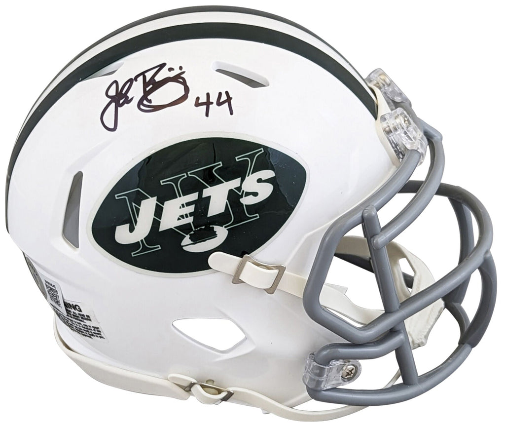 This Autographed 1965-77 Throwback Speed Mini Helmet has been Personally Signed by John Riggins of the New York Jets. This item is 100% Authentic to include a hologram by Beckett Authentication Services. This item will come with the new Beckett Authentication hologram that has a scannable QR code rather than the traditional COA. If you would like to have a COA, you are welcome to reach out to Beckett for a printed certification once you receive your item. This is a BAS Witnessed Protection Program item which means a Beckett Authentication Service representative was present when this item was being signed. We conducted an autograph signing with John Riggins where multiples of the same item were signed. While the photographs are representative of this item, the size, placement and strength of the signature may vary. Each item is hand signed, therefore, each autograph is unique. This item can be verified through BAS Witnessed.