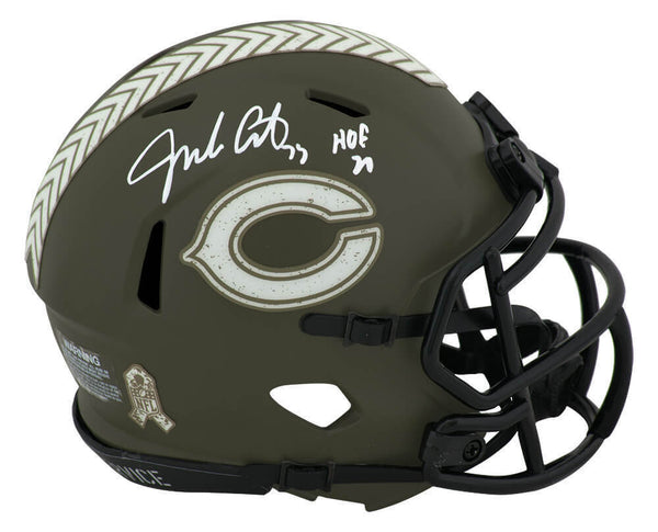 Jim Covert signed Chicago Bears Salute to Service Riddell speed mini helmet with 'HOF 20' inscription. Item comes with a Schwartz Sports Memorabilia tamper-proof numbered hologram and Certificate of Authenticity which can be verified online.