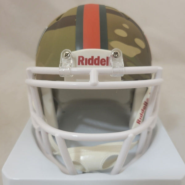 JIM KELLY AUTOGRAPHED MIAMI HURRICANES CAMO SPEED MINI HELMET WITH BECKETT QR COATHIS MEANS THE HELMET WAS SIGNED WITH A BECKETT REPRESENTATIVE PRESENT SO YOU CAN BE 100% CERTAIN ITS THE REAL THING.