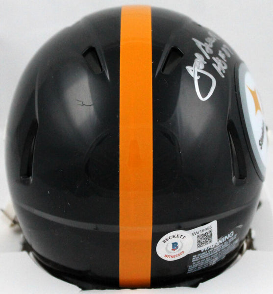 Joe Greene Autographed Steelers 63-76 Speed Mini Helmet w/HOF-Beckett W Hologram *Silver This is a Hand Autographed Mini Helmet of Joe Greene of The Pittsburgh Steelers. This is a Riddell Football 63-76 Speed Mini Helmet. Inscribed HOF. This item has a Beckett Witnessed Authentication, which Comes with a Beckett #'ed hologram and a QR code for verification. You can view this item on the Beckett website and it shows when and where the item was signed. It was signed either at a public autograph appearance or a Private Signing. This is a stock photo of the item. Although you may not receive this exact item, the item you receive is virtually identical and brand new in great shape.