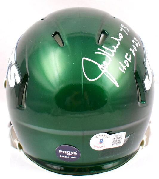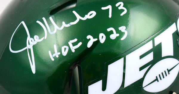 Joe Klecko Autographed New York Jets Speed Mini Helmet w/HOF-Beckett W Hologram *White This is a Hand Autographed Mini Helmet of Joe Klecko of The New York Jets. This is a Riddell Football Speed Mini Helmet. Inscribed HOF 2023. This item has a Beckett Witnessed Authentication, which Comes with a Beckett #'ed hologram and a QR code for verification. You can view this item on the Beckett website and it shows when and where the item was signed. It was signed either at a public autograph appearance or a Private Signing. This is a stock photo of the item. Although you may not receive this exact item, the item you receive is virtually identical and brand new in great shape.