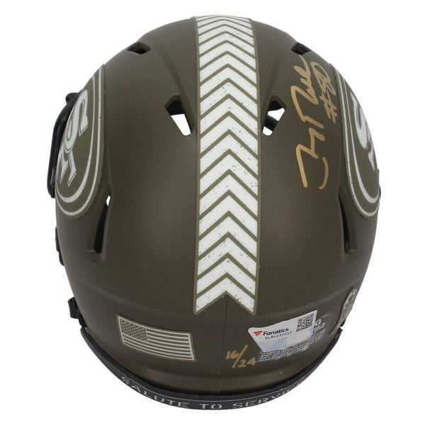This San Francisco 49ers Salute to Service Speed mini helmet has been personally hand-signed by Joe Montana and Jerry Rice. It comes with an individually numbered, tamper-evident hologram from Fanatics Authentic. To ensure authenticity, the hologram can be reviewed online. This process helps to ensure that the product purchased is authentic and eliminates any possibility of duplication or fraud.This helmet is limited to 24 and you are bidding on number "16" from the edition.